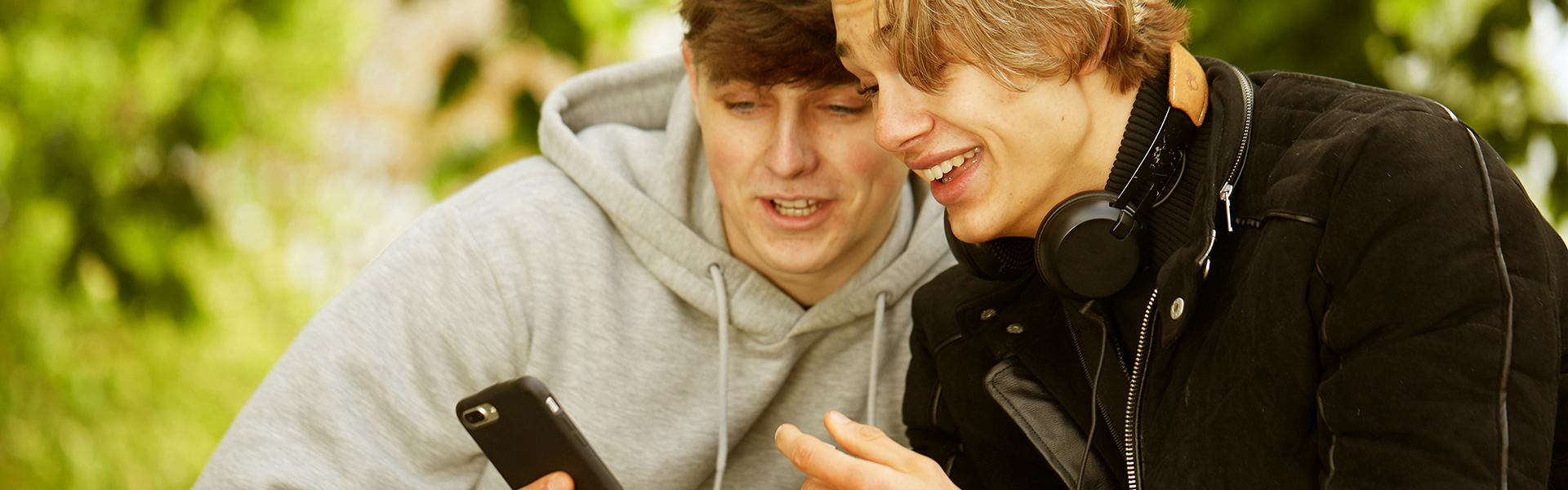 Two boys looking at a phone and smiling in the park.